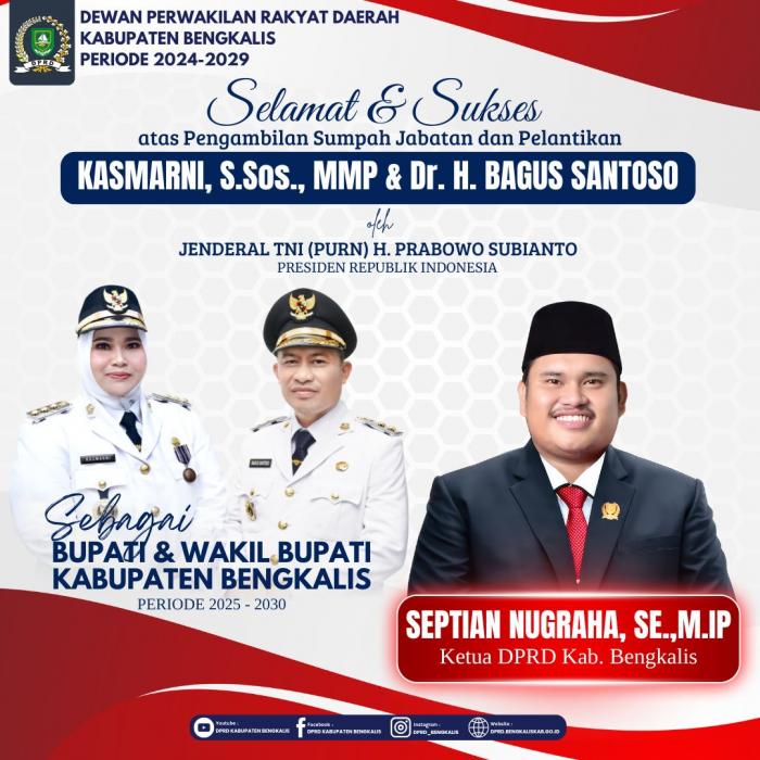 PARLEMEN, Bengkalis, - Ketua DPRD Kabupaten Bengkalis Septian Nugraha, SE., M.IP, memberikan ucapan selamat dan sukses atas pelantikan Bupati dan Waki